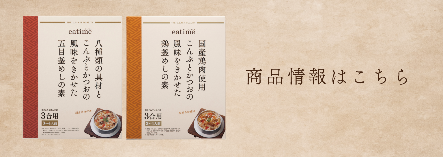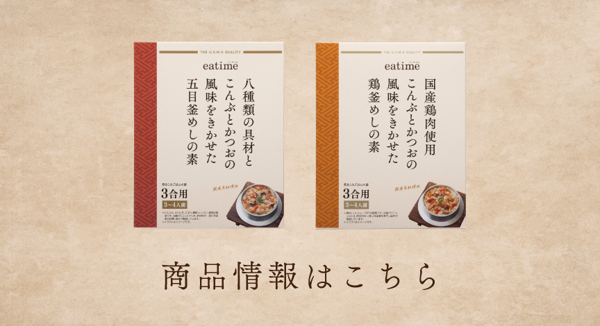 ふたを開けた瞬間に、立ちのぼる湯気とともに広がるだしと炊きたてのごはんの豊かな香り。ひと口ごとに旨味がしみわたるごはんを、ゆっくりと味わうそれこそが釜めしの醍醐味です。そんな本格的な味わいを、家庭で手軽に楽しめるのが「eatime 釜めしの素」。お米と一緒に炊き上げるだけで、手間をかけずにそんな釜めしを家庭で手軽に楽しめます。