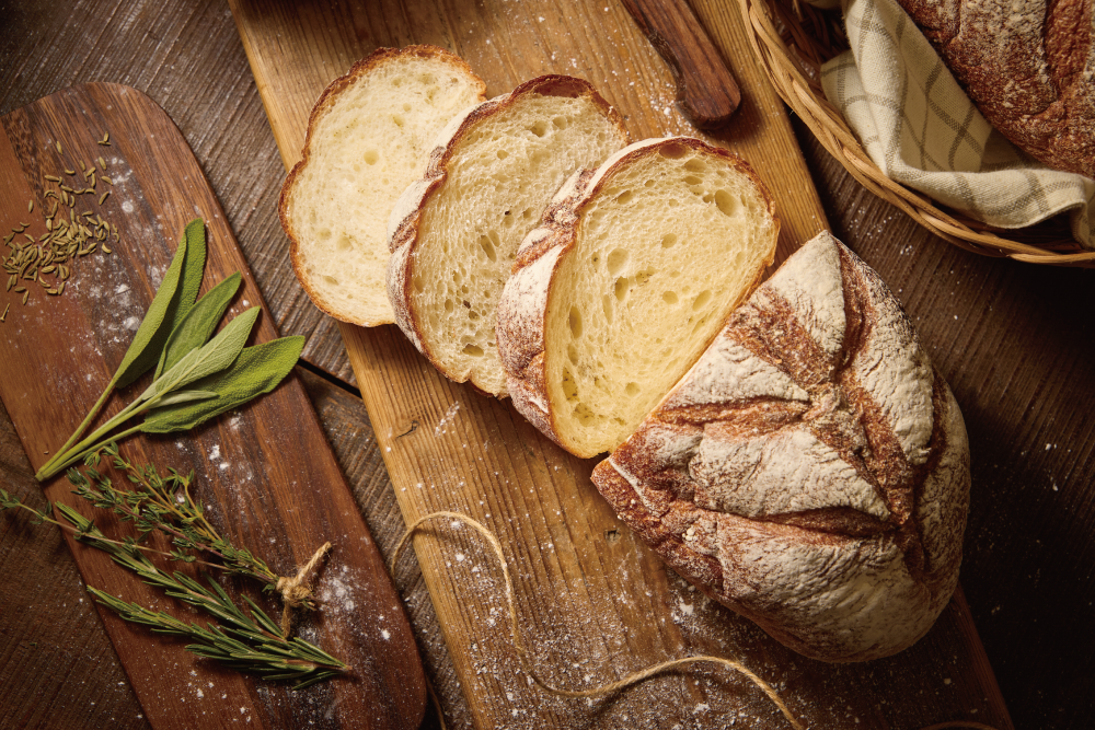 もちもち食感の多加水パンで4種の香り高いハーブ(セージ、タイム、フェンネル、ローズマリー)を生地に練り込んで焼きあげました。