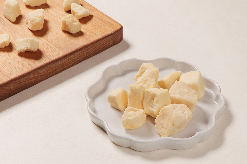 フリーズドライにしたメロンに、ホワイトチョコレートをしみこませました。